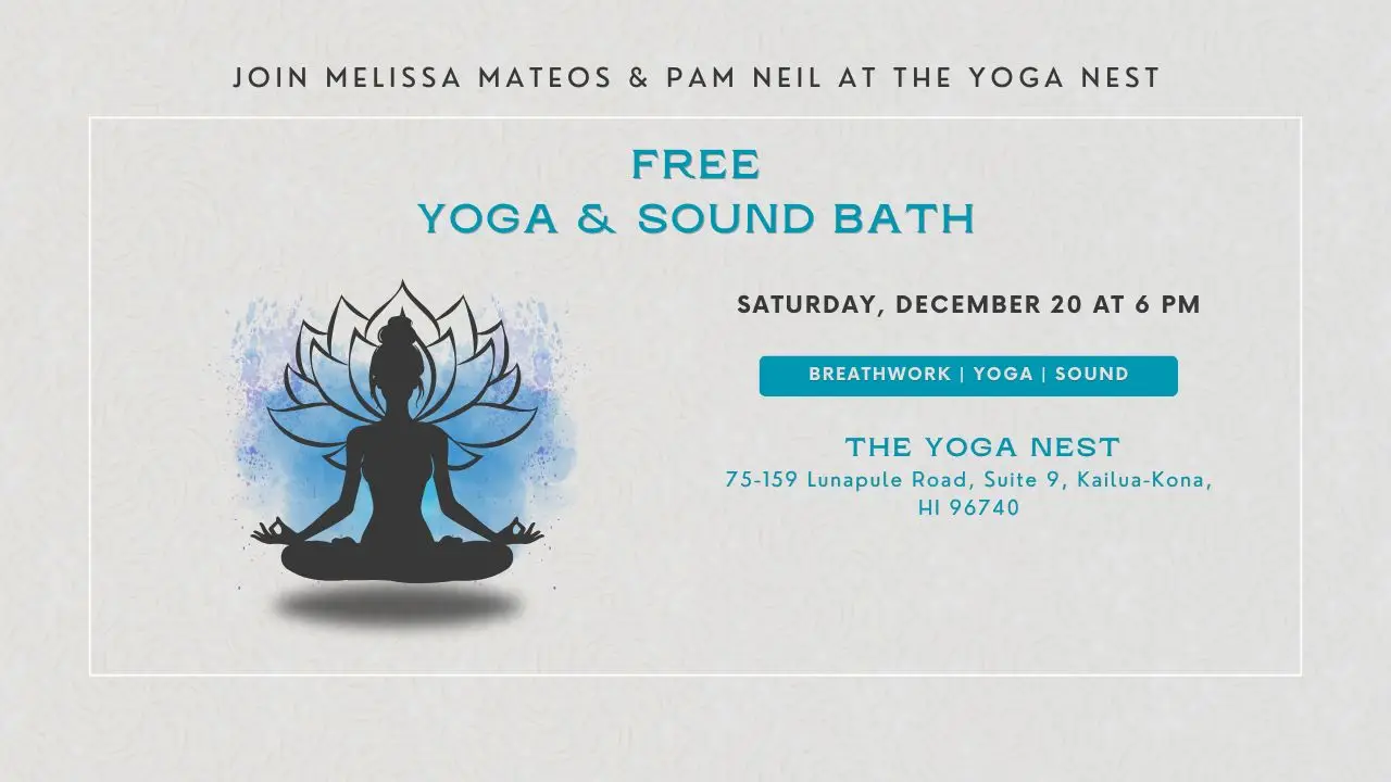 Join us for a free, heart-centered journey of Breathwork, Gentle Yoga, and Sound Healing — held at the Yoga Nest on December 20 at 6 PM.